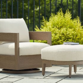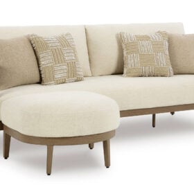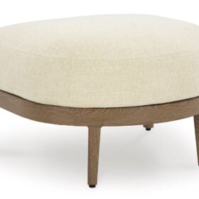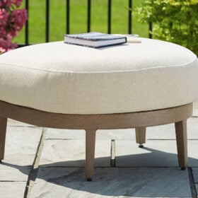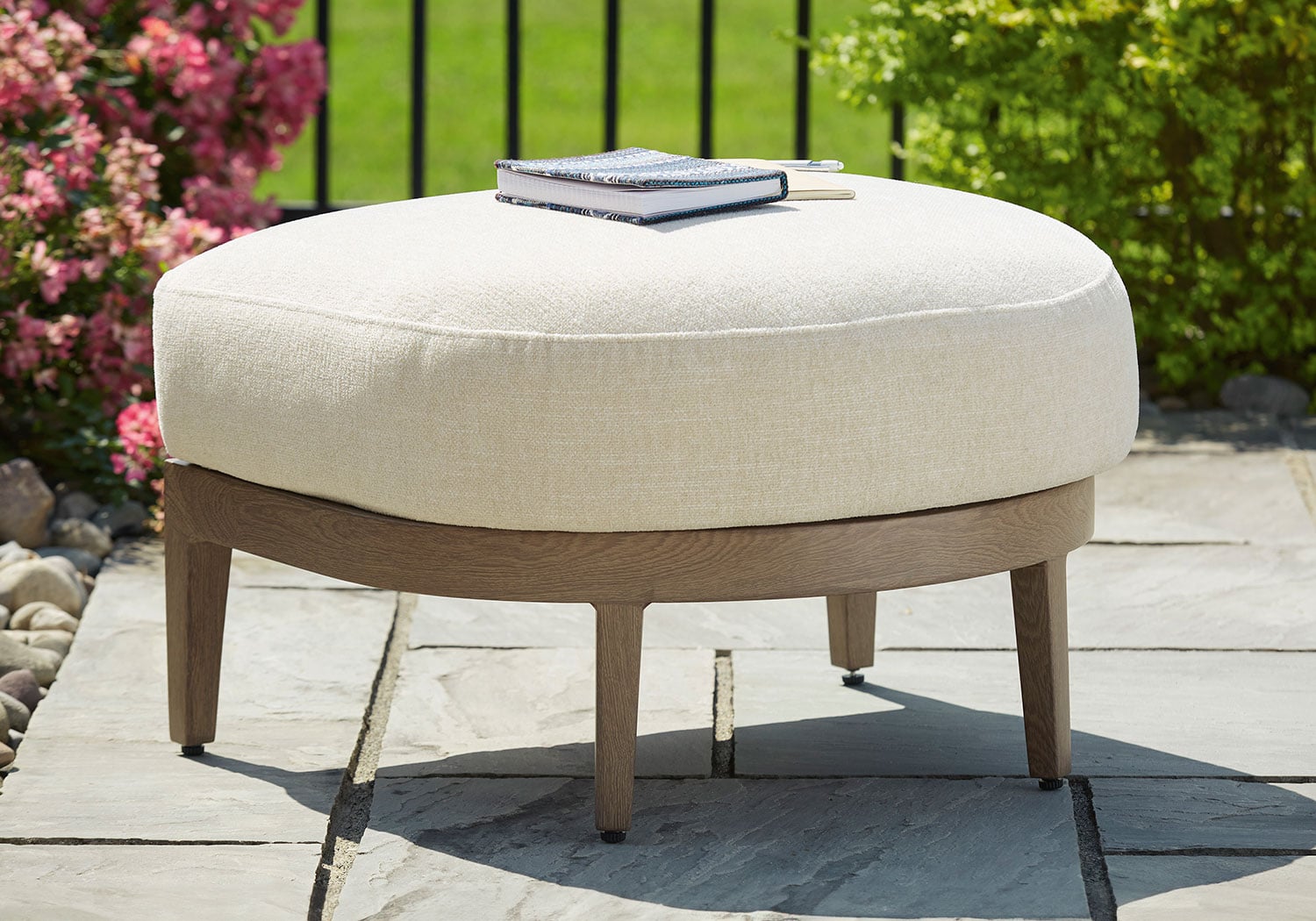 Elevate the appeal of easy-breezy living with this outdoor ottoman. Made to look like wood yet durable enough to weather the elements, it’s sure to serve you and your besties well, year after year. The gentle curve of the frame is echoed in the cushion, which is covered in Nuvella+™ high-performance fabric. Talk about plush refinement.
