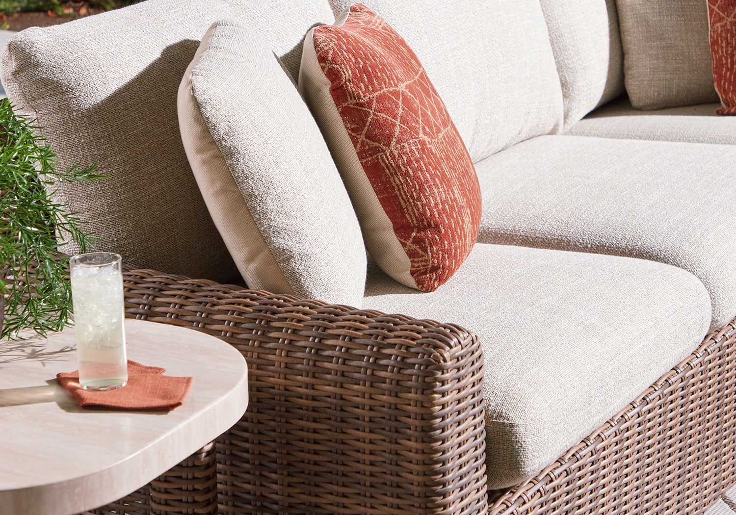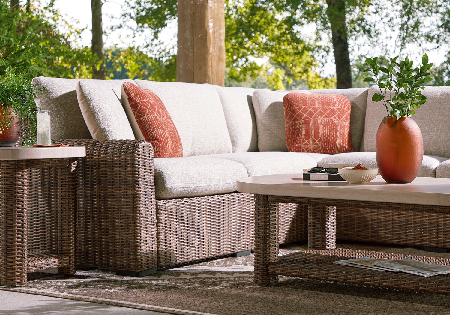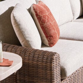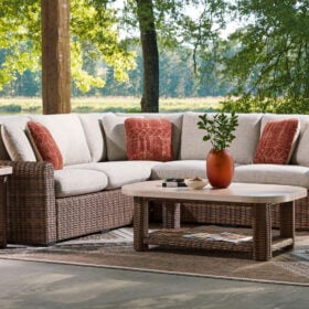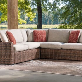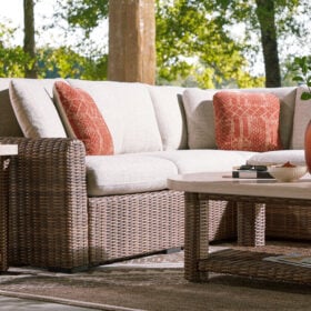 Get back to nature with the relaxed styling of this outdoor sectional. Crafted with a sturdy aluminum frame and resin wicker, it offers exceptional durability and style. The sectional’s plush cushions, covered in high-performance Nuvella® fabric, are as resilient as they are attractive. Sounds like fabulous form and function to us.