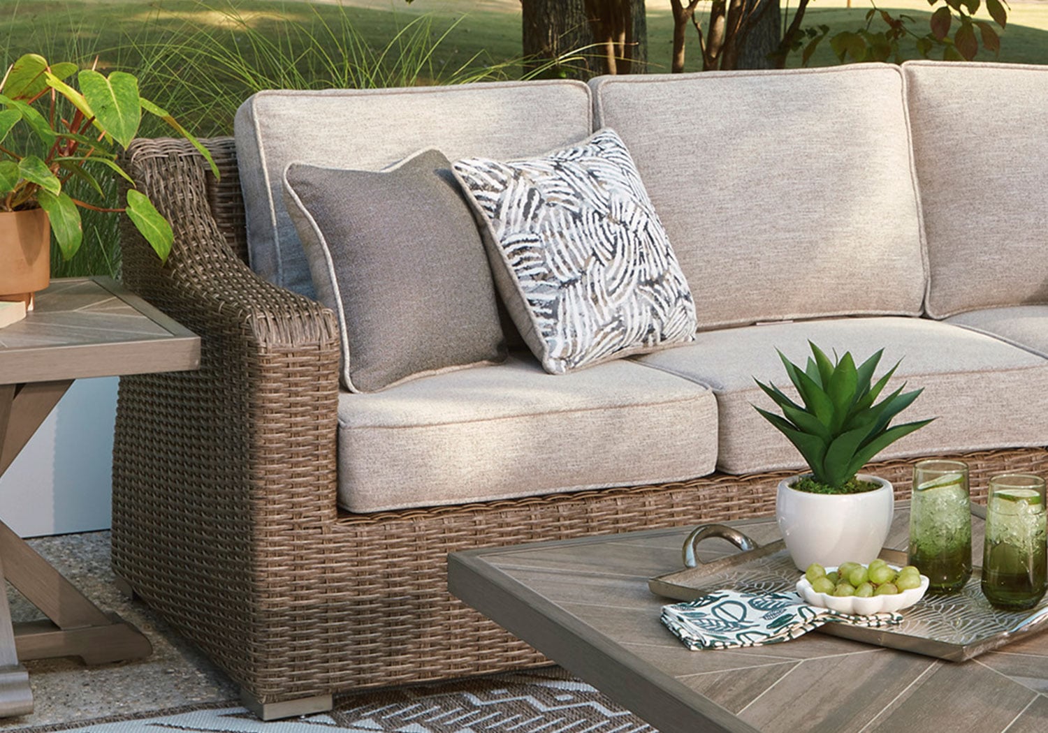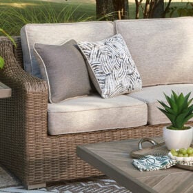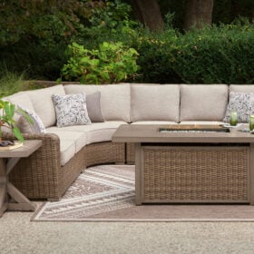 Who says the great outdoors isn’t made for luxury living? This outdoor sectional offers all of the high-end design, plush comfort and durability you could ask for, and then some. Its all-weather aluminum frame and resin wicker provide the easy-breezy look you love without the high maintenance. And rest assured—the high-performing Nuvella® fabric is made to stand up to the elements.