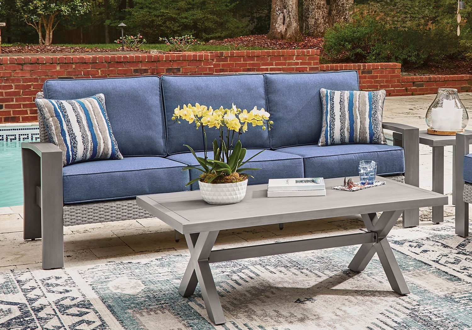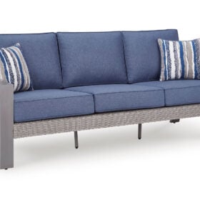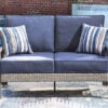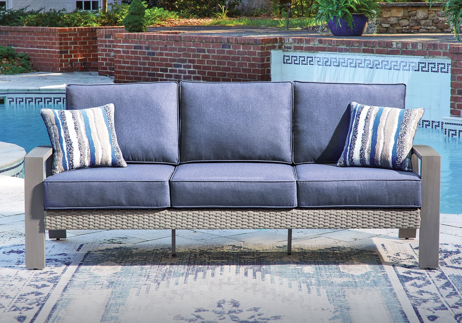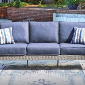 High style crafted for low-maintenance living. Turn your outdoor space into a sweet retreat with this sofa. The casually cool piece entices in an easy-breezy gray resin wicker over an all-weather aluminum frame, for an upscale aesthetic that’s downright durable. Its plush seat cushions, wrapped in high-performance Nuvella® fabric, are indulgently comfortable yet so easy to maintain. Accent pillows add delightful flair.