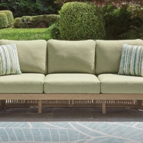 Round out your outdoor living space with the naturally beautiful look of wood. This cushioned sofa will serve up seasons of relaxation on your back deck or sitting pretty by the pool. The couch’s gently curved, open-weave design is crafted from eucalyptus wood and polyester rope, for the perfect merger of high fashion and lasting durability. Plush cushions and accent pillows are wrapped in cleanable, UV-resistant Nuvella® fabric, making stylish living a breeze.