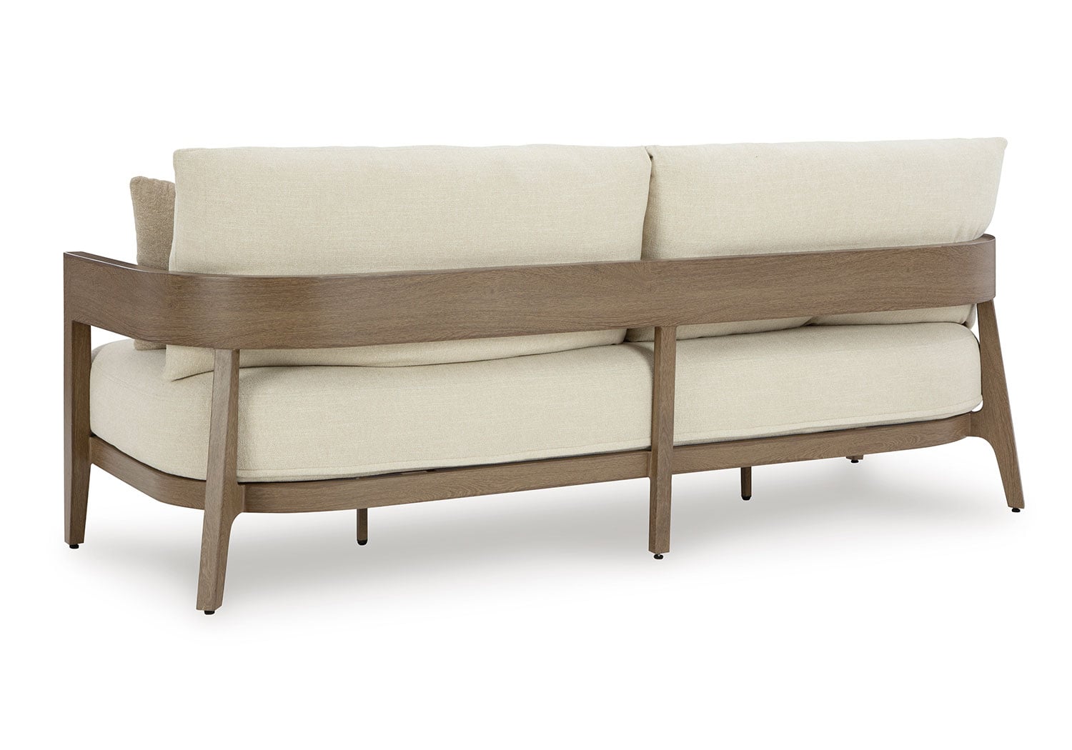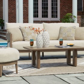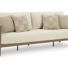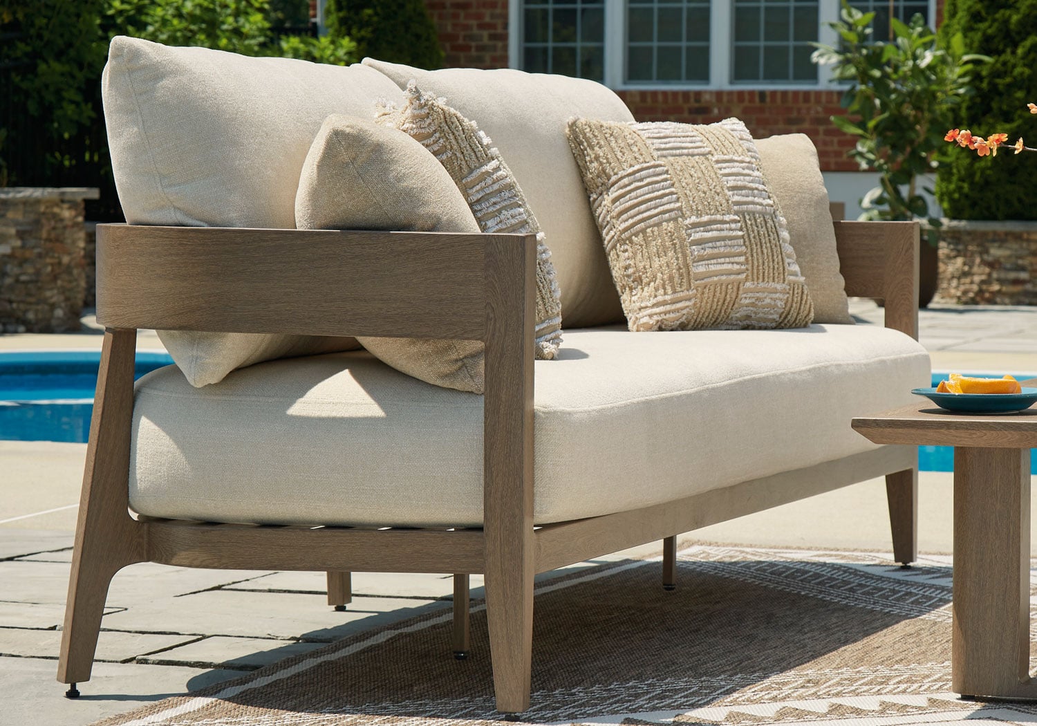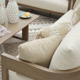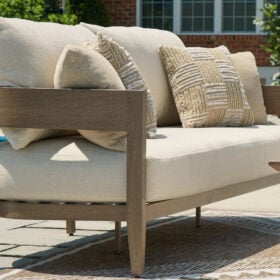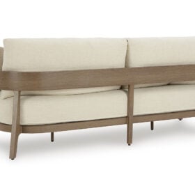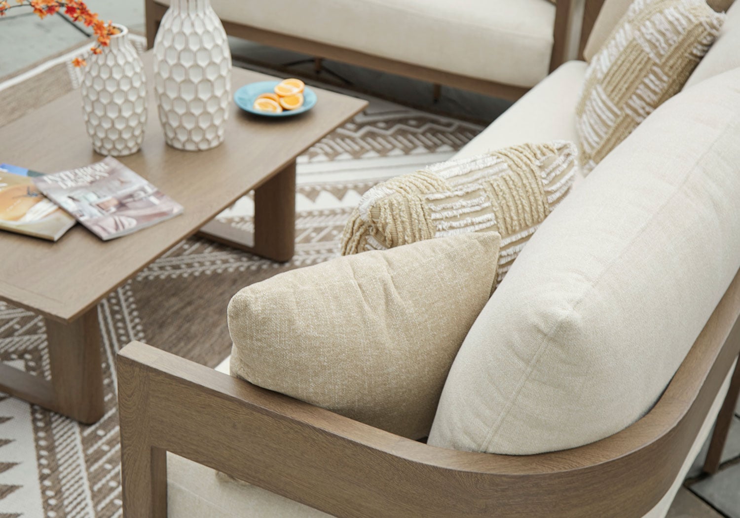Elevate the appeal of easy-breezy living with this outdoor sofa. Made to look like wood yet durable enough to weather the elements, it’s sure to serve you and your besties well, year after year. The gently curved piece features cushions wrapped in Nuvella+™ high-performance fabric for plush refinement. Patterned accent pillows infuse delightful texture.