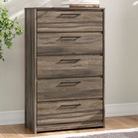 Rest in the casually cool style of this Panel Series. A weathered brown finish over replicated oak grain creates an easygoing vibe, setting the scene in your restful retreat. Clean lines and modern handles provide a fuss-free look.