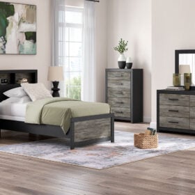 Comfy, functional and versatile, this bookcase Series evokes the tranquil vibe you long for in your dream destination. Its two-tone textured look marries a rustic gray finish and a matte black finish over replicated oak grain for neutral appeal. Three open cubbies in the headboard add space-saving storage, keeping favorite reads, bedtime essentials and so much more within easy reach.